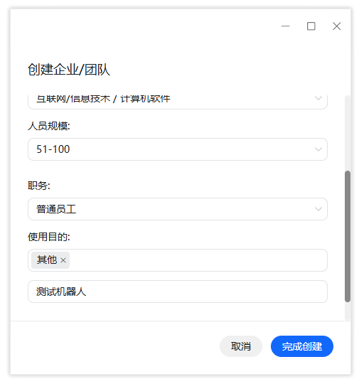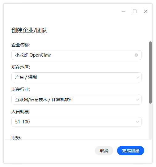 2.填写信息并创建。(填写 “企业名称” 后会出现如下内容需要填写,企业名称需要超过三个字,内容可随便填写,无特殊要求)
