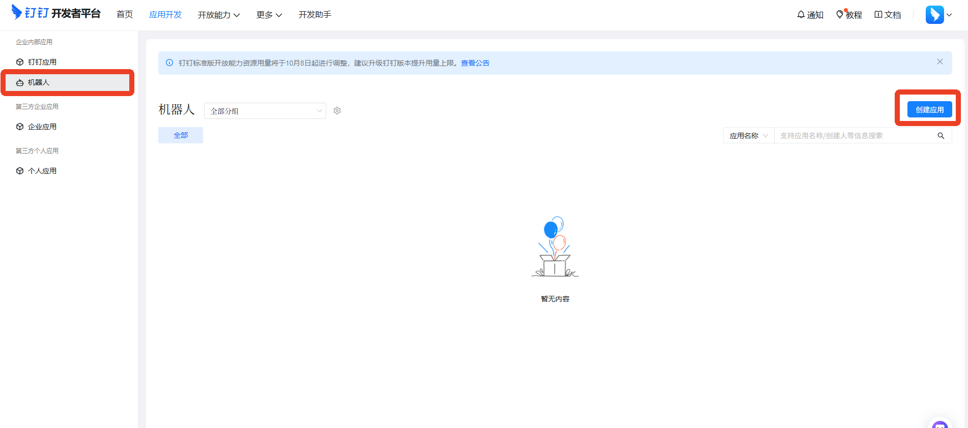 2.左侧栏目选择“机器人”后,点击“创建应用”。
