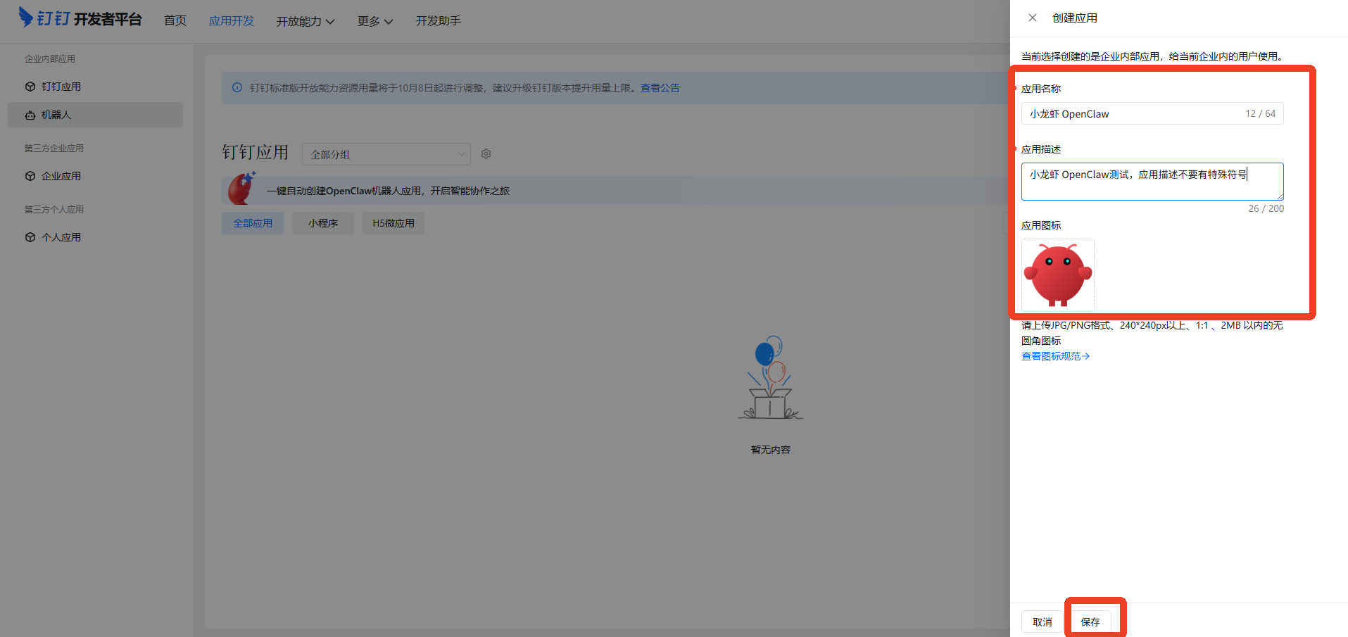 3.填写“应用名称”和“应用描述”后点击“保存”。