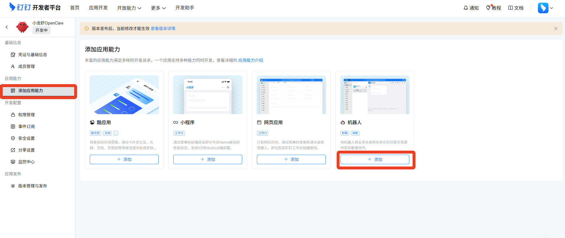 4.在左侧栏目选择“添加应用能力”并选择添加“机器人”。