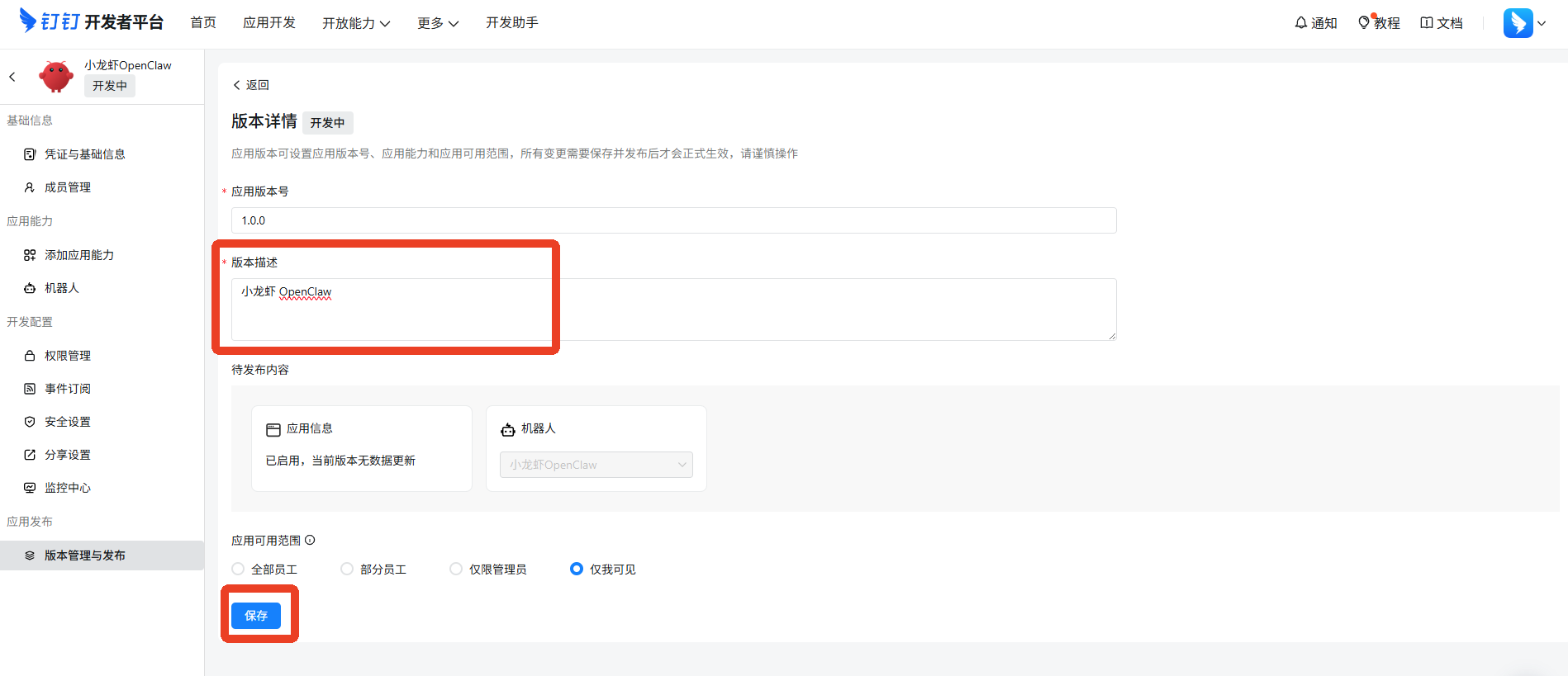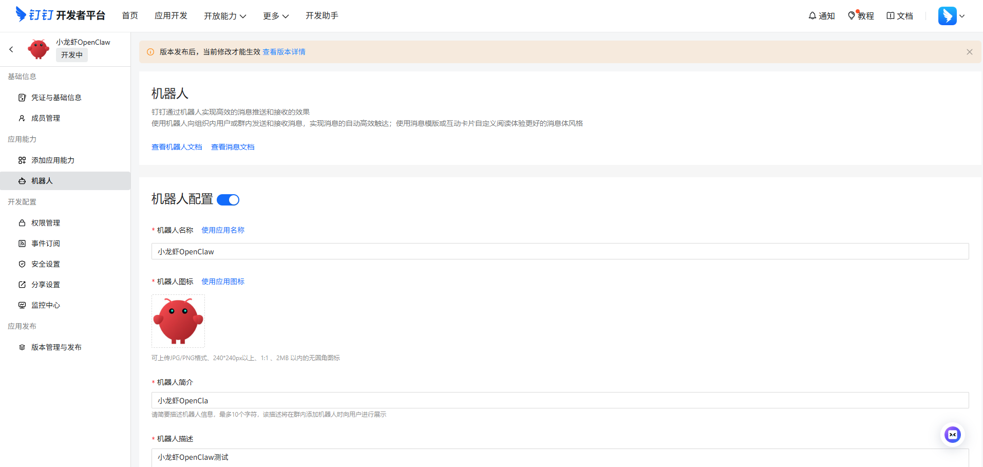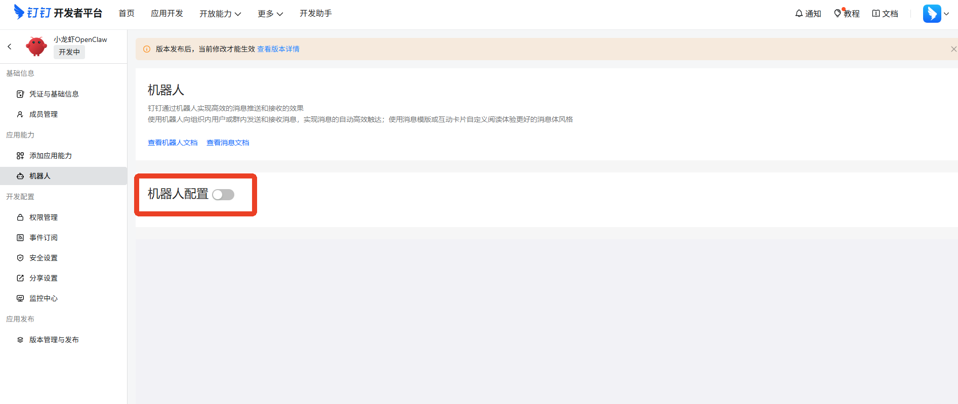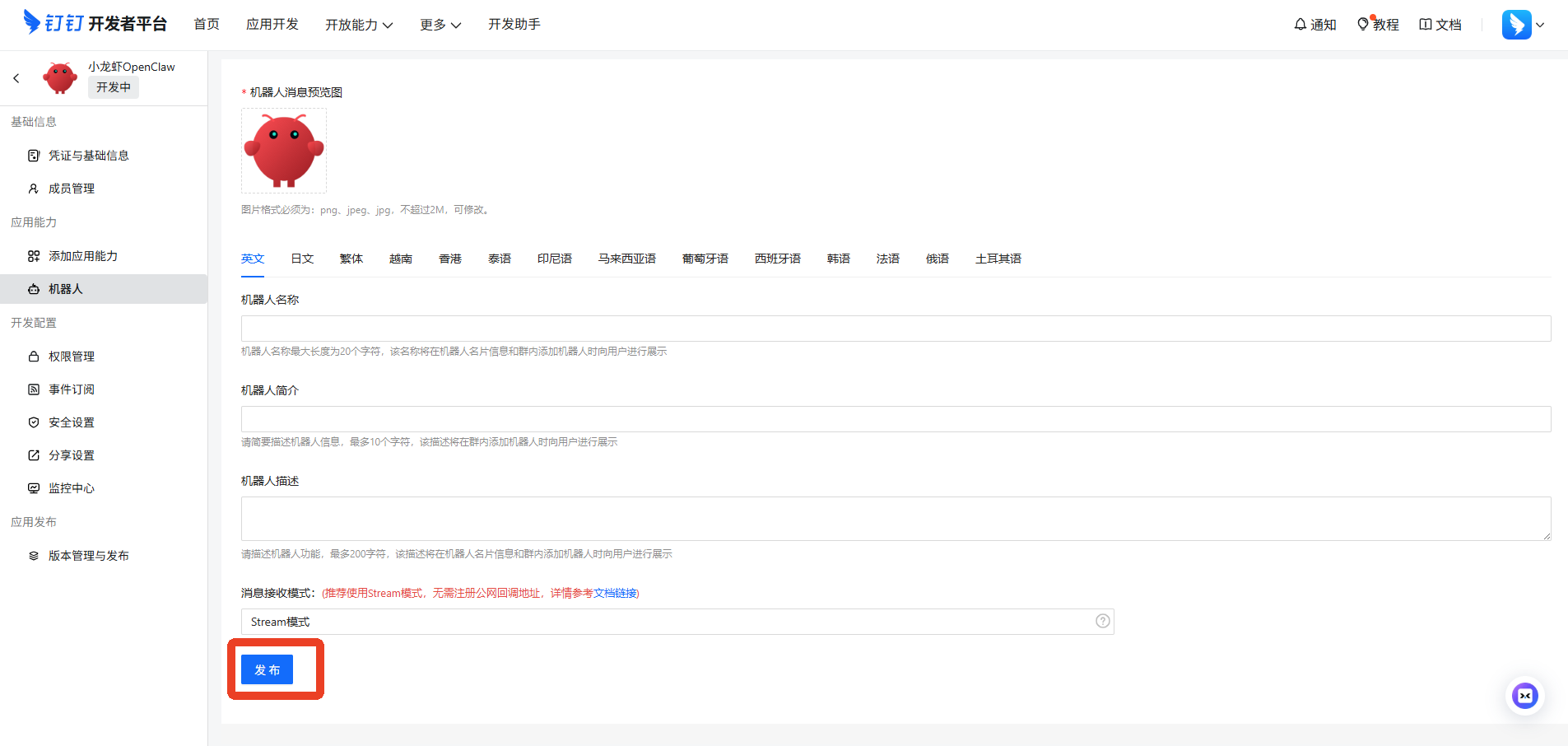 5.开启机器人配置并填写相关内容,最后点击“发布”。
