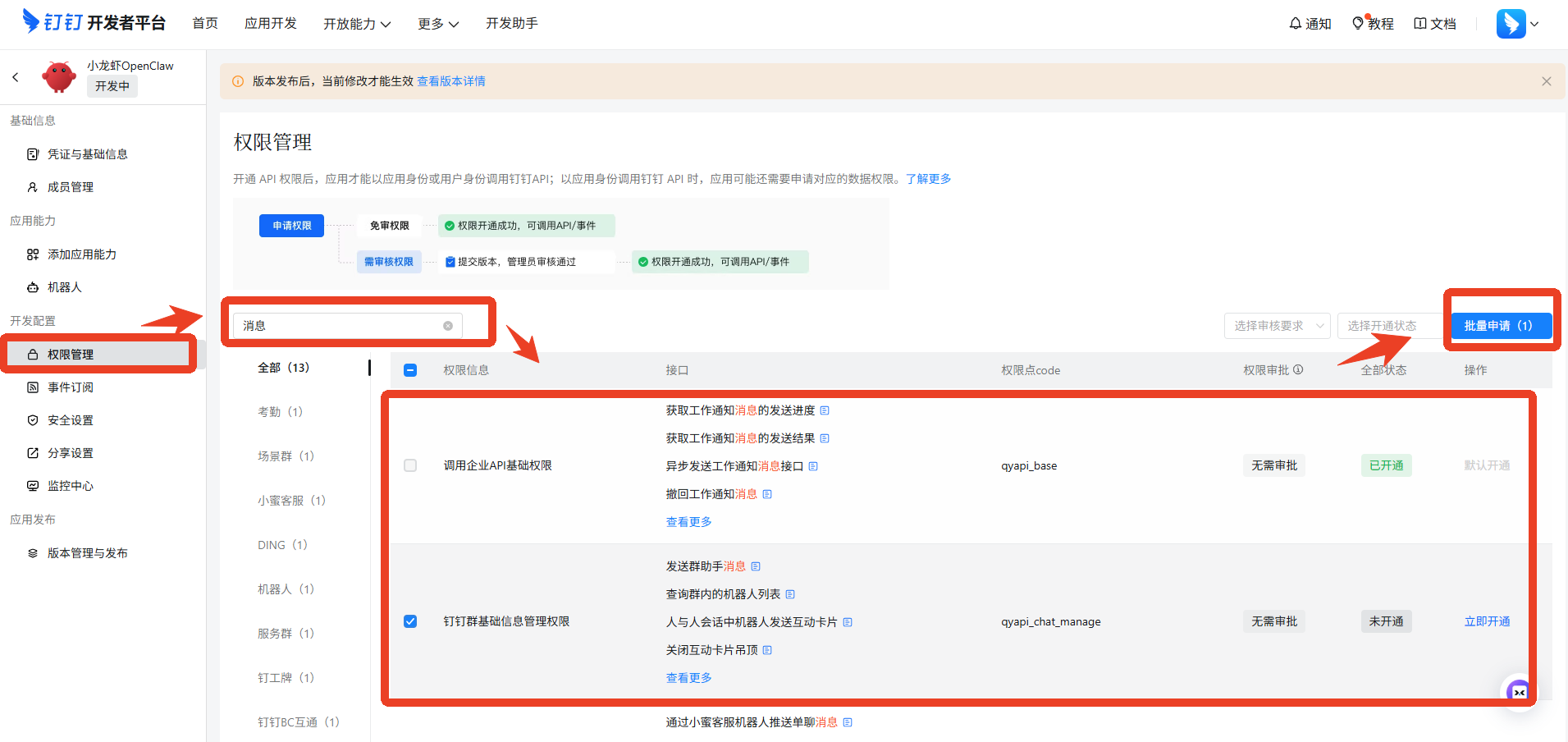 1.在左侧栏目选择“权限管理”,搜索“消息”,勾选图中两项后点击“批量申请”。