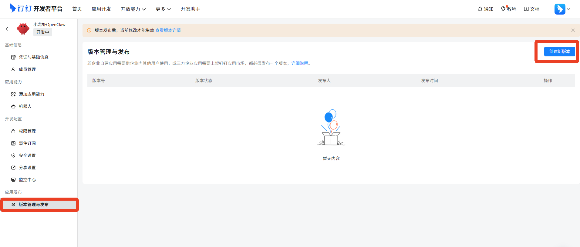 2.在左侧栏目选择“版本管理与发布”后,点击创建新版本,必须创建版本信息才能够发布。