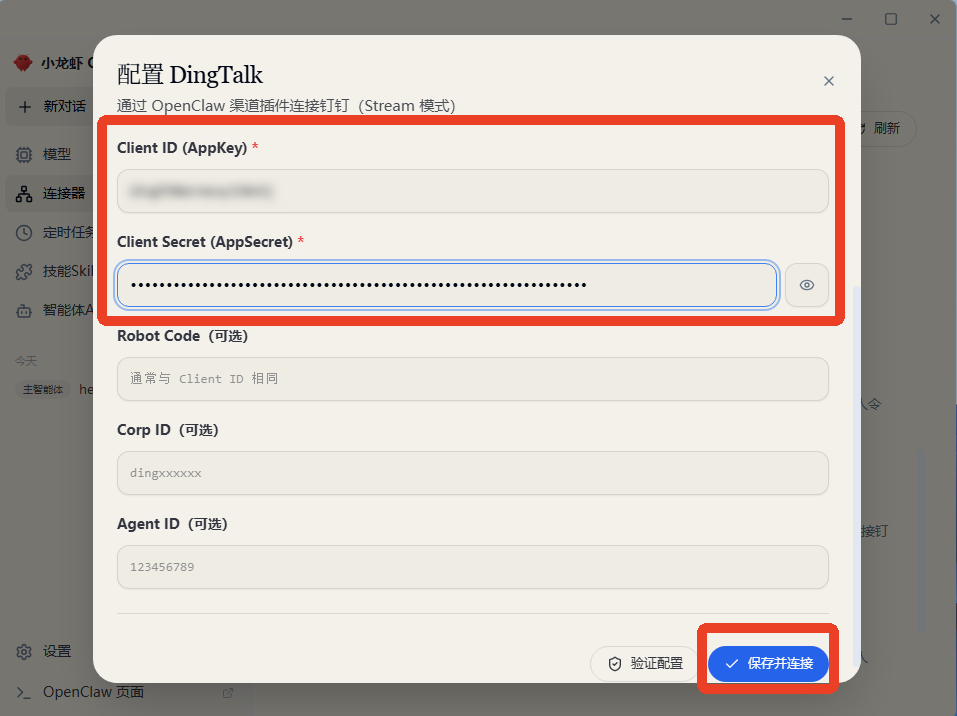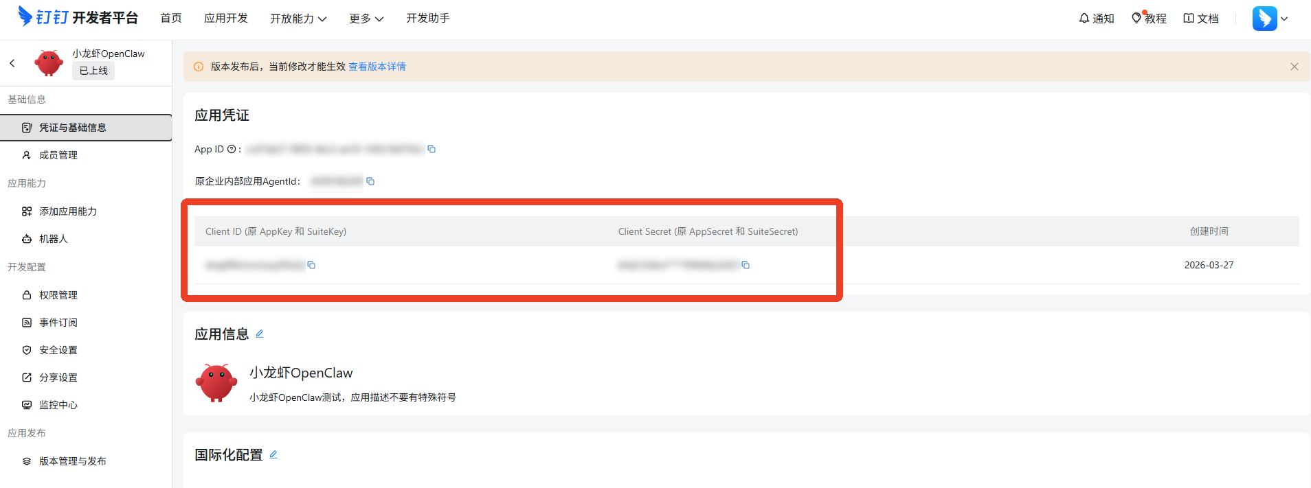 4.选择左侧栏目的“凭证与基础信息”,复制Client ID 和 Client Secret 到 小龙虾OpenClaw客户端中保存并连接即可完成互联。