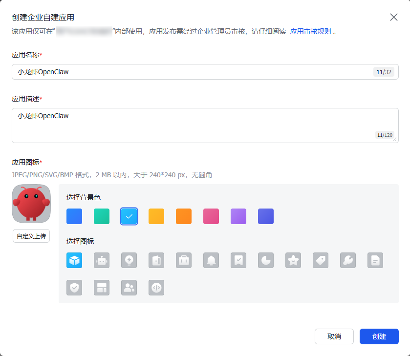点击“创建企业自建应用”,填写应用名称和描述,选择应用图标。