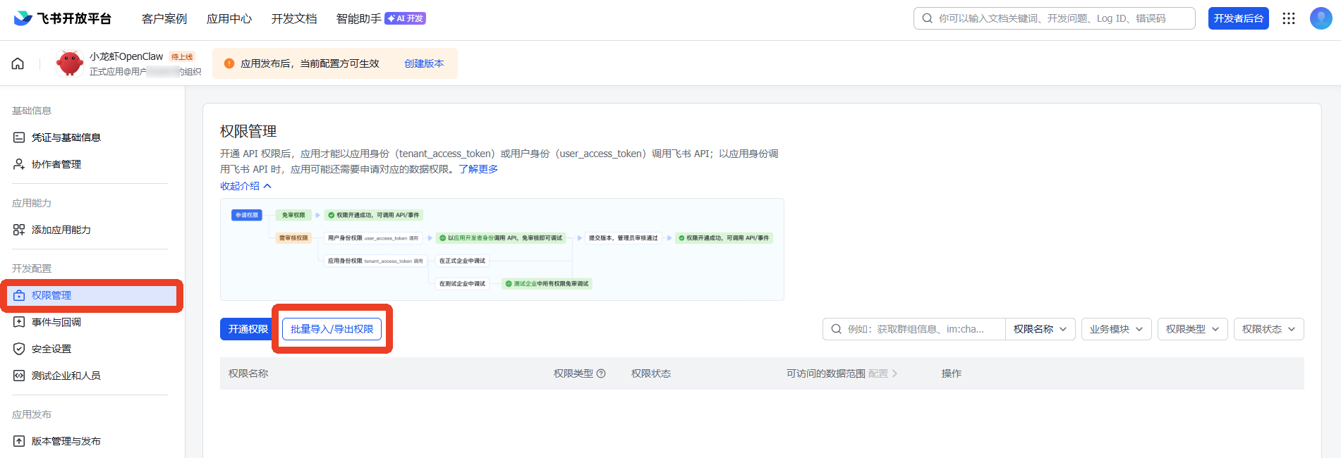 在“权限管理”页面,点击“批量导入”按钮,粘贴以下JSON 配置一键导入所需权限: