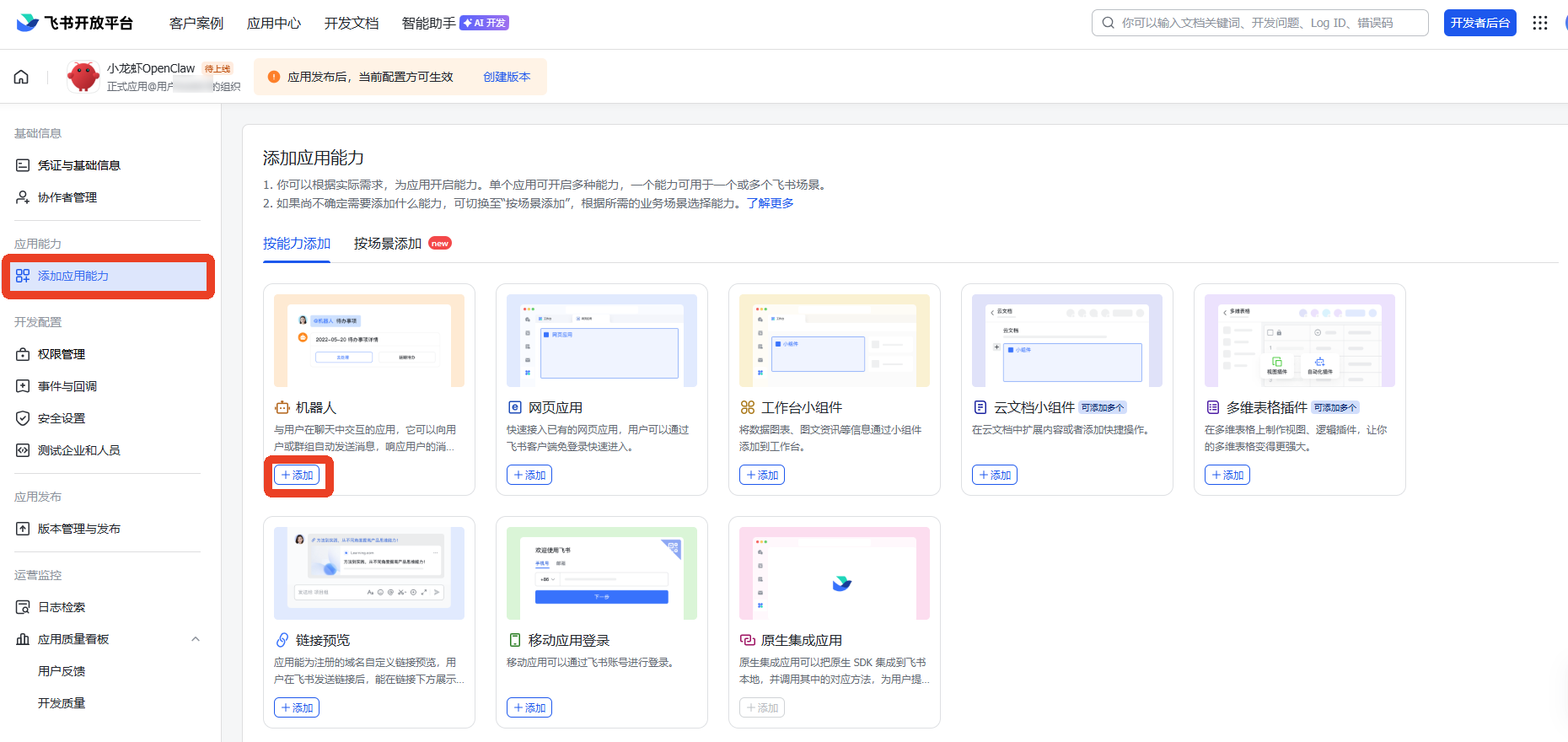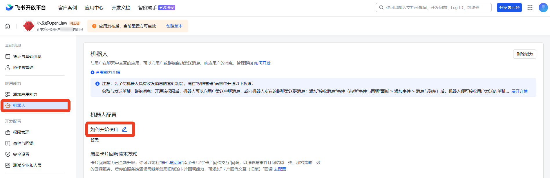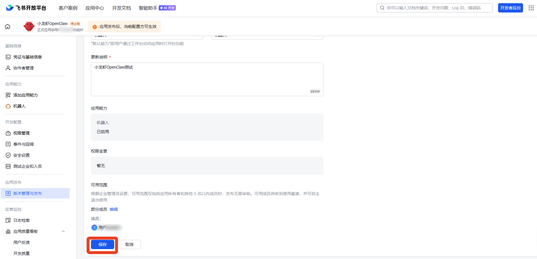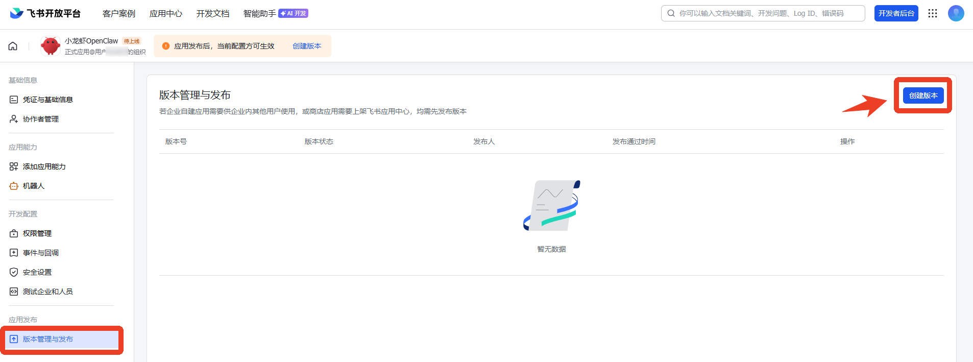 在“版本管理与发布”页面创建版本,提交审核并发布,等待管理员审批(企业自建应用通常自动通过)。