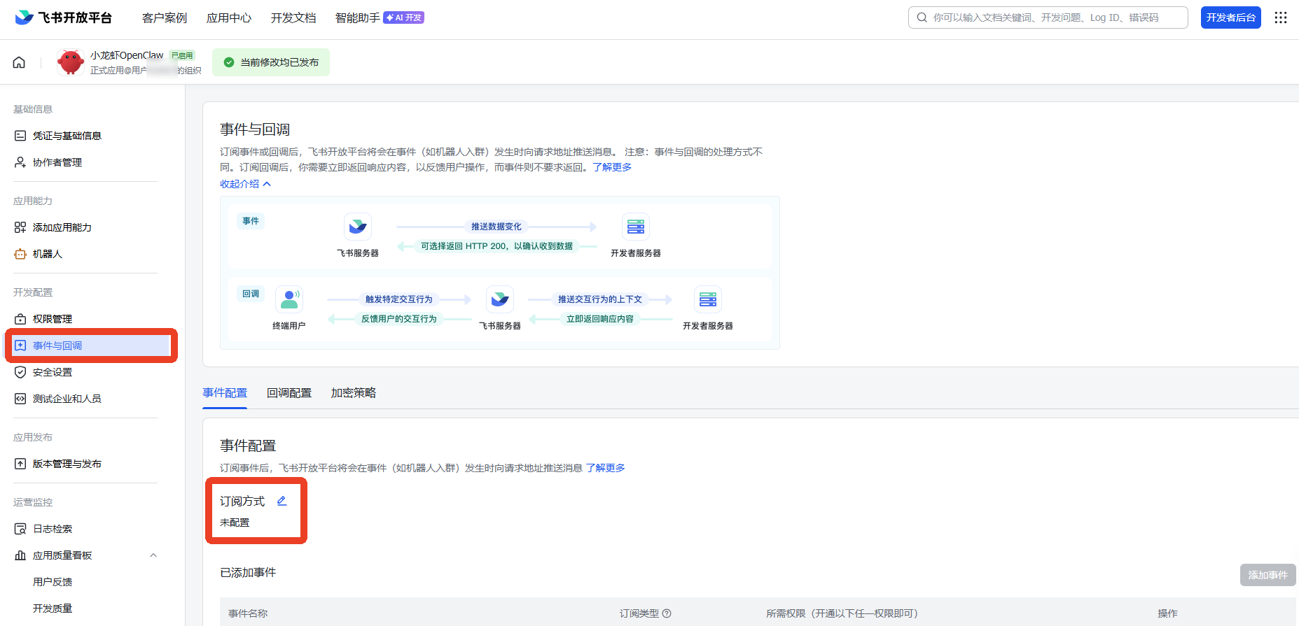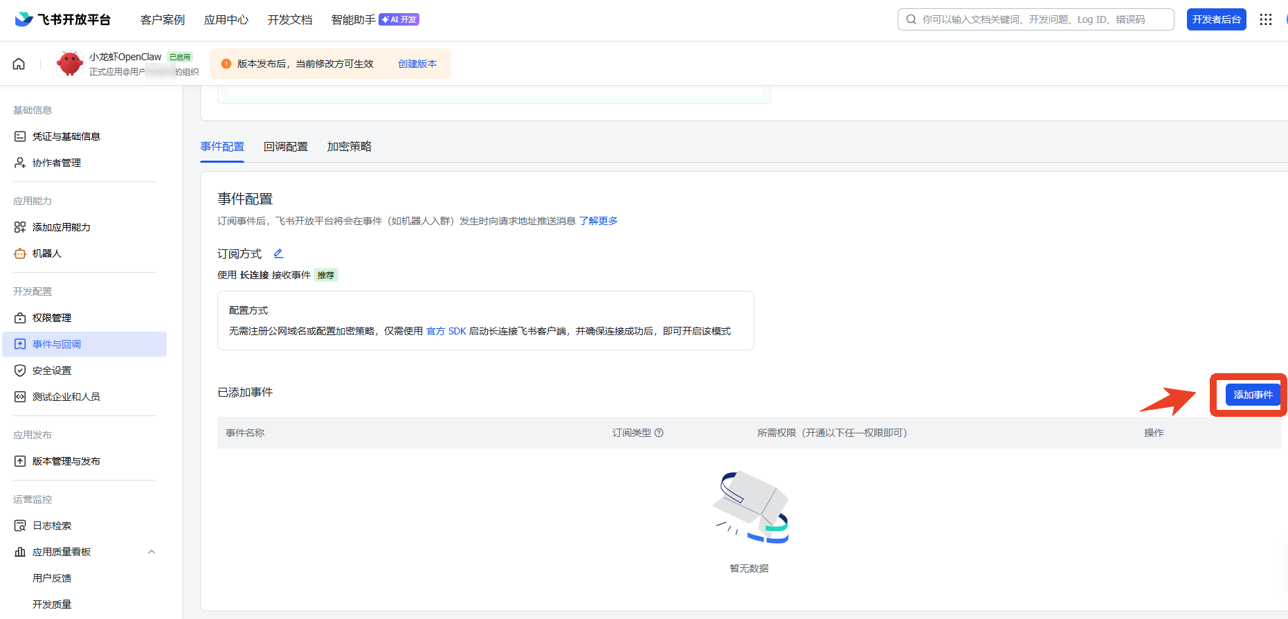 【注意:应用版本是否发布成功,不成功无法选择“使用长连接接收事件”】