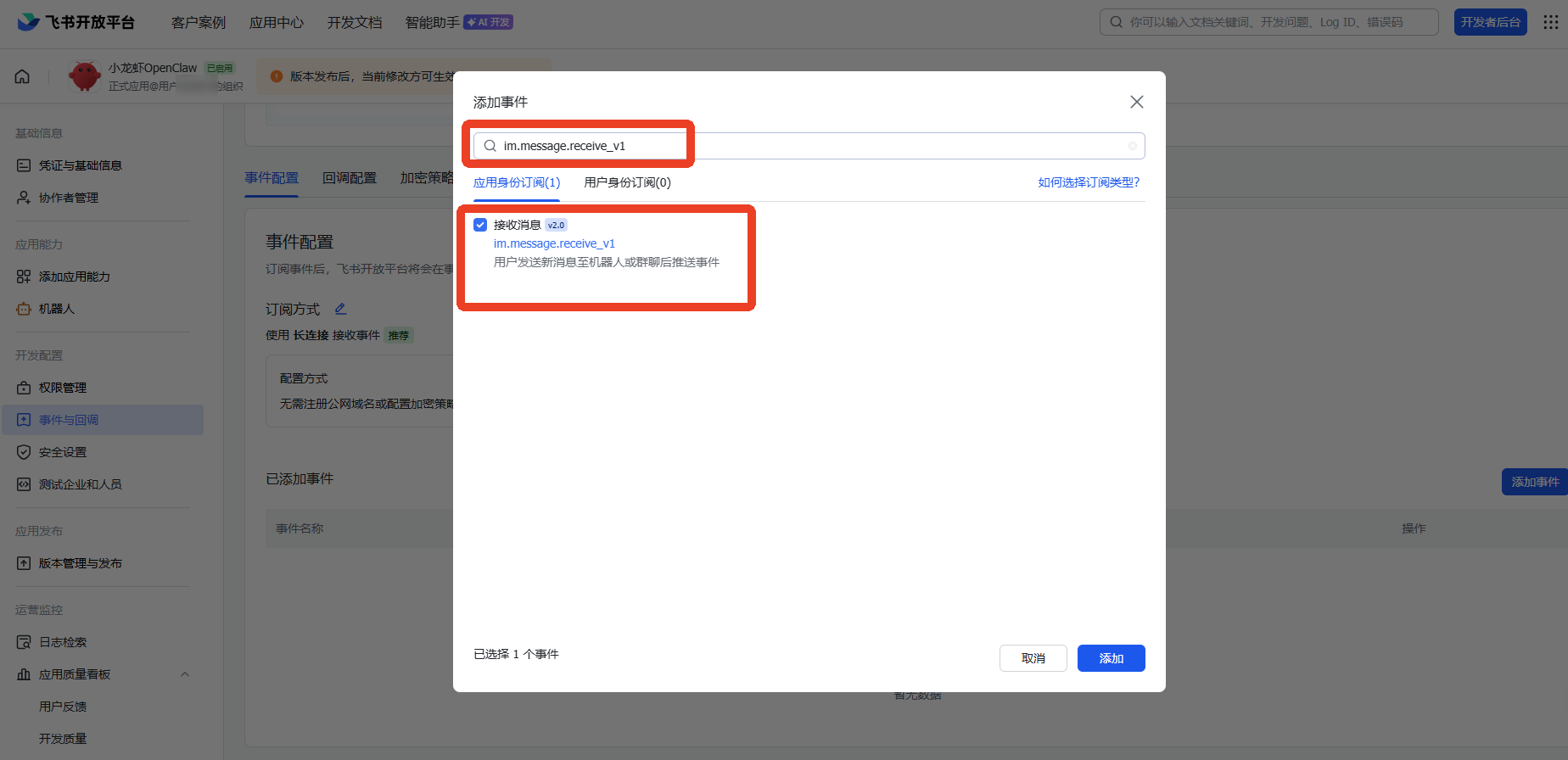 (1)选择“使用长连接接收事件”(WebSocket 模式)。