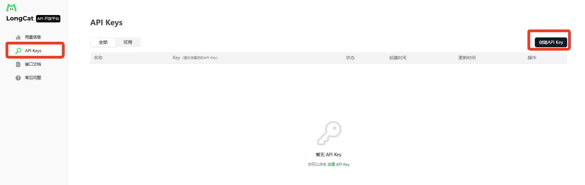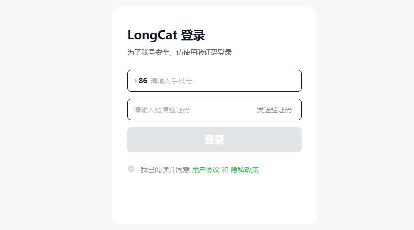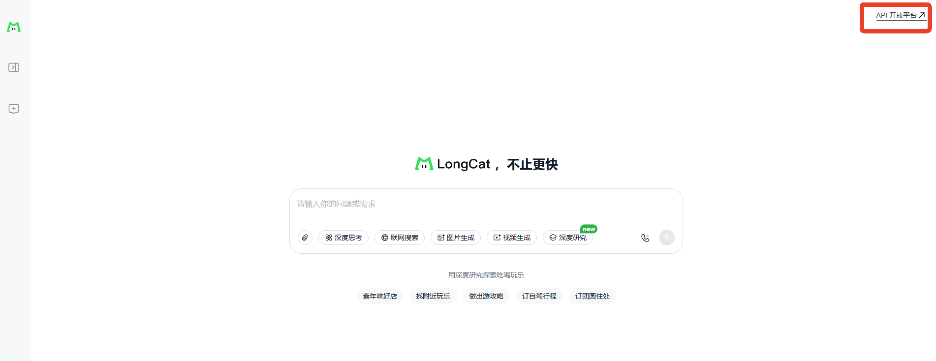 进入龙猫AI (https://longcat.chat/),点击页面右上角“API开放平台”,用手机号注册登录。