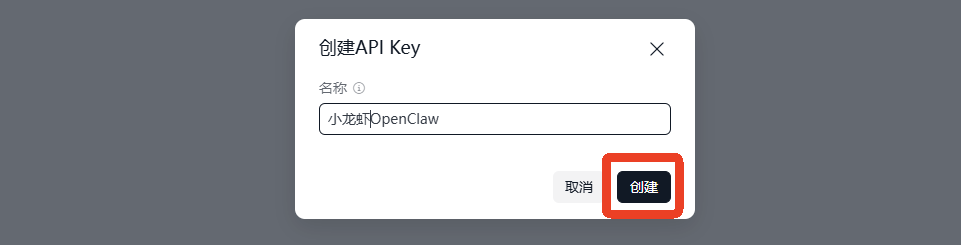 (2)输入API key名称,点击“创建”。
