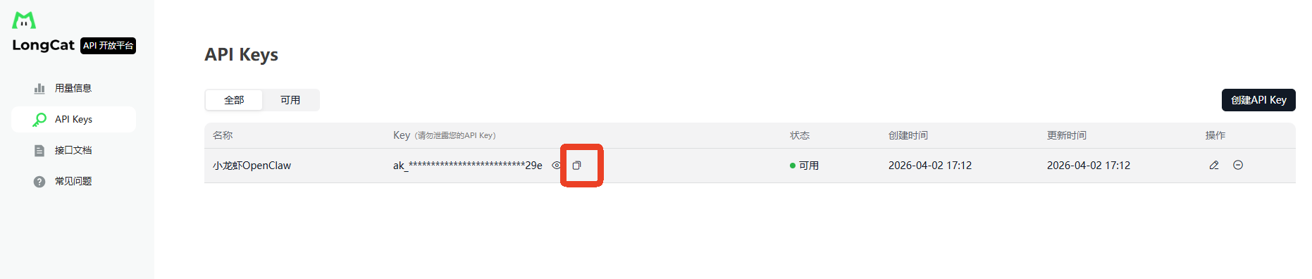 (3)点击“复制”创建好的API key。