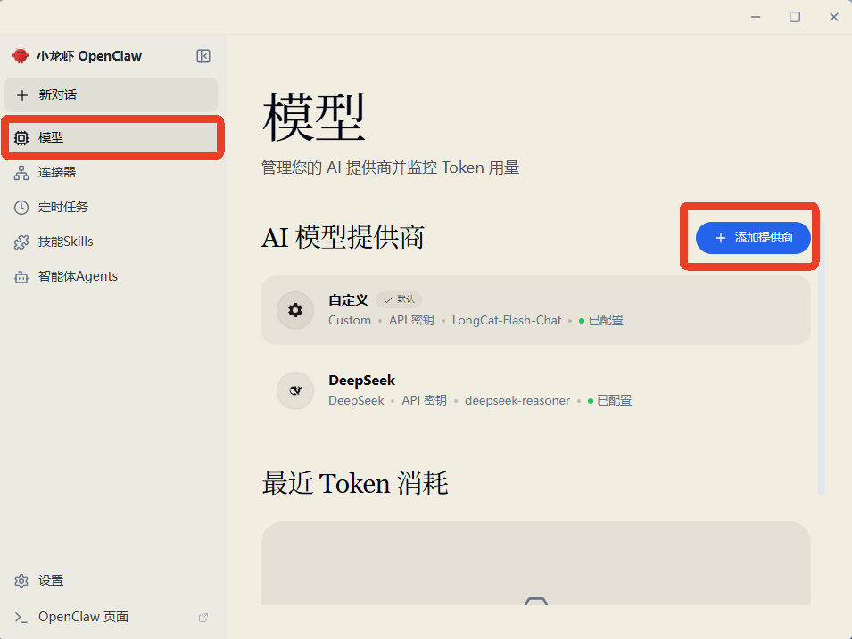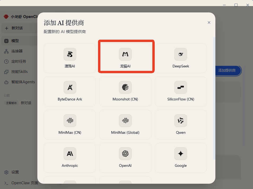 (1)打开小龙虾OpenClaw,点击“模型”—“添加提供商”,选择“龙猫AI”。
