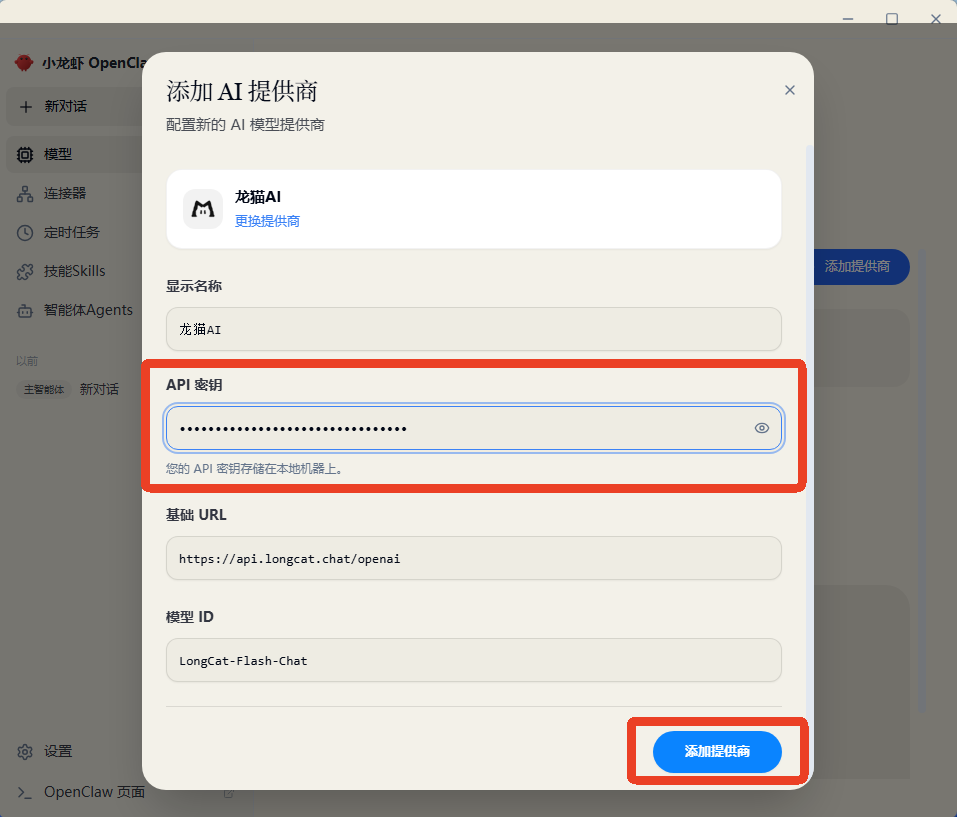 (2)将在龙猫AI平台复制的API key填入“API密钥”,再点击“添加提供商”,即可完成配置连接。