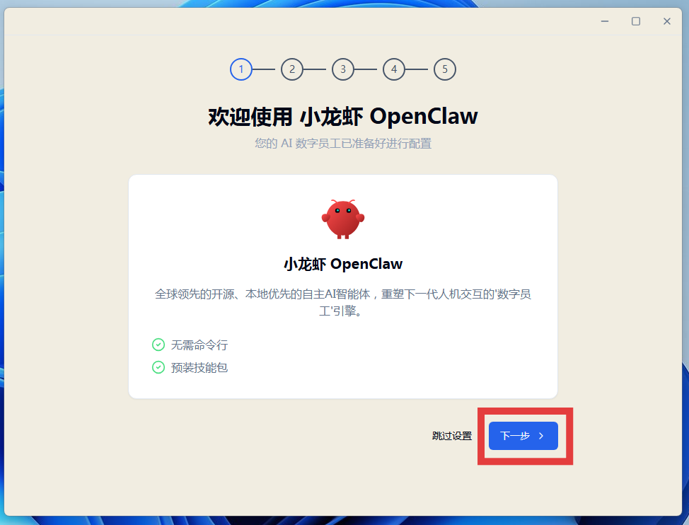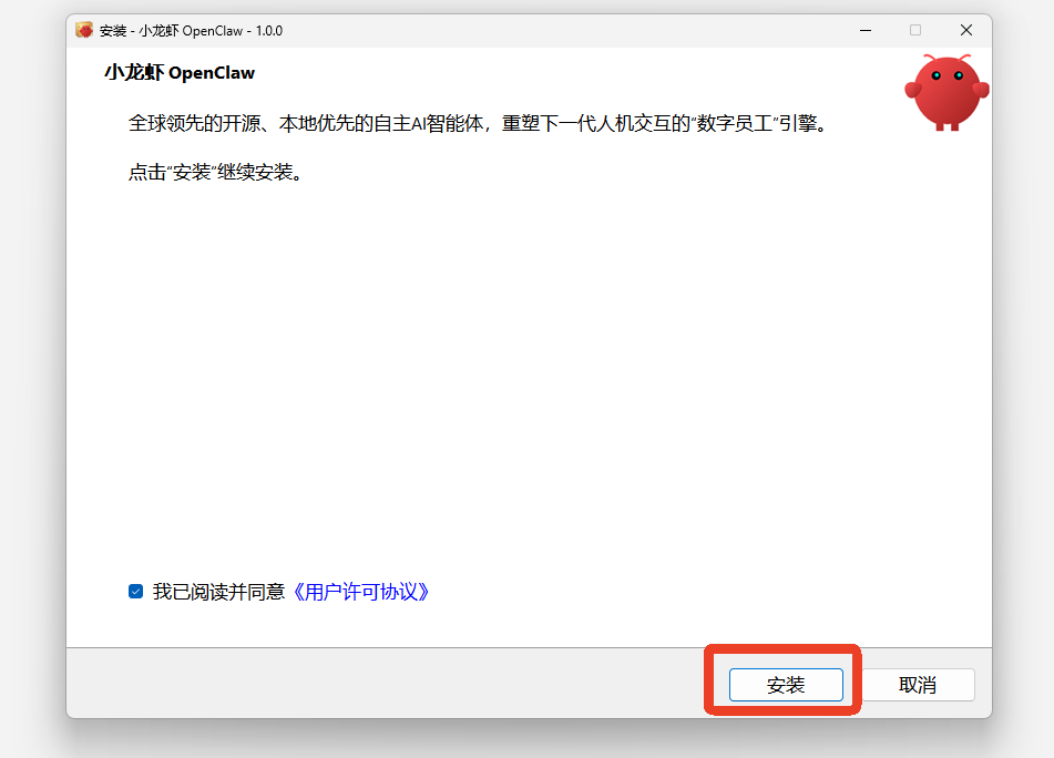 2.打开下载好的小龙虾OpenClaw安装包,点击“安装”,等待安装完成。