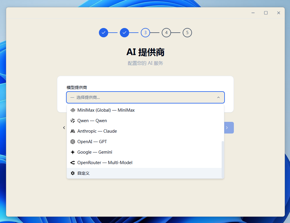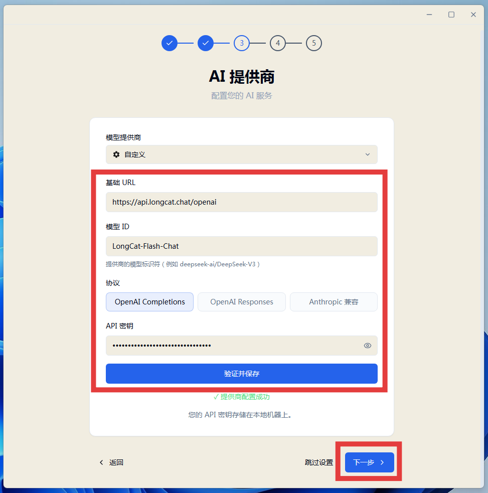 4.点开“模型提供商”下拉列表,选择需要配置的模型,设置好“基础URL”、“模型ID”、“API密钥”后,点击“验证并保存”—“下一步”—“开始使用”即可。